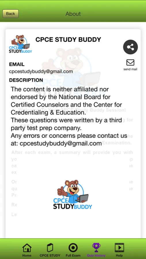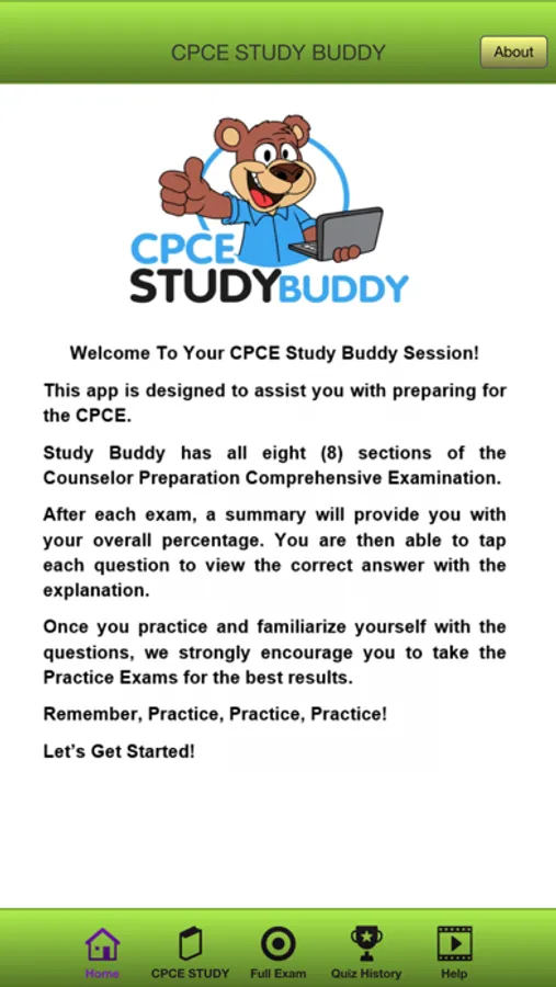 Welcome To Your CPCE Study Buddy Session! This app is designed to assist you with preparing for the CPCE. Study Buddy has all eight (8) sections of the Counselor Preparation Comprehensive Examination. After each exam, a summary will provide you with your overall percentage. You are then able to tap each question to view the correct answer with the explanation. Once you practice and familiarize yourself with the questions, we strongly encourage you to take the Practice Exams for the best results. Get your studdy buddy today!