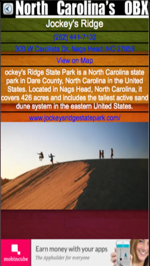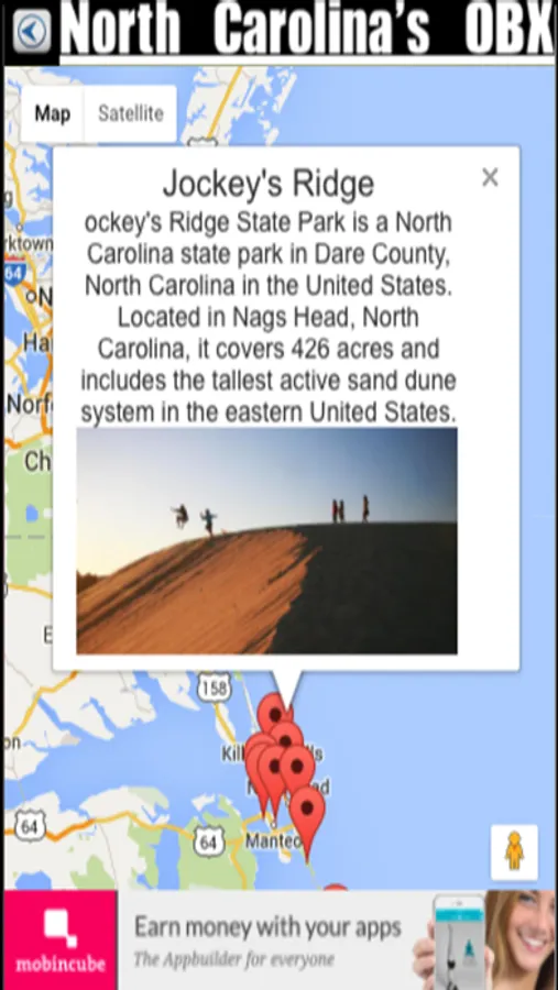 The OBX Tourist Destinations App is an interactive mapping application of the top tourist destinations in the Outer Banks (OBX) of North Carolina. The map features address, information and contact information as well as pictures and detailed information on the specific attraction. The locations are listed below that are included in the application.