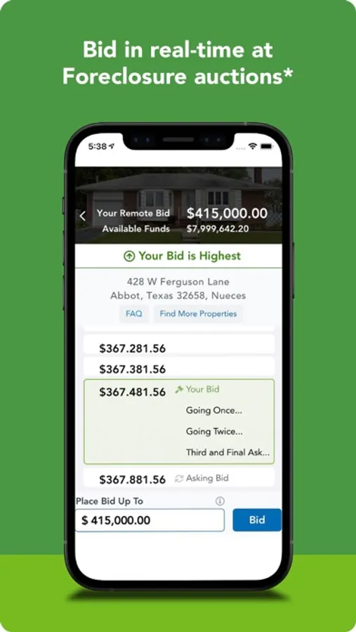 Auction.com’s mobile app gives you access to powerful features to search, bid and win properties on-the-go. Find houses by location, property features, auction date and more. Or use the interactive map to find homes in local or national markets. With the app, you can access property details, see photos and conduct your due diligence with free title and property reports, when available. Save your favorites to your dashboard and never lose track of them. You’ll typically receive emails when your favorites are postponed, canceled or cleared for sale. If you find a property that’s being auctioned, you may be able to use our app to bid directly from your device.