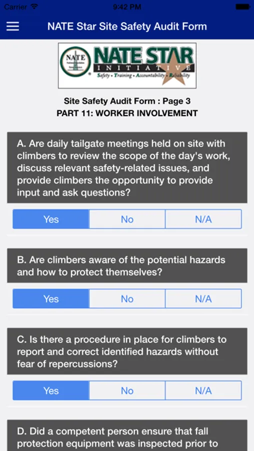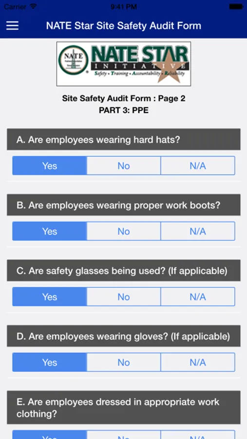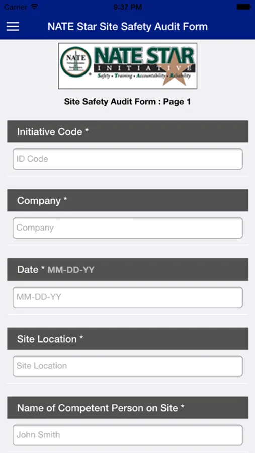 The National Association of Tower Erectors (NATE) STAR Initiative App was created for approved users when completing the Site Safety Audit Forms. This is a mobile friendly way to complete the Audit forms while completing the audit in real time. Upon opening the App, the user will be prompted to log in with their username. Upon successful login, they will see the Site Safety Audit form. They can then enter the information in page-by-page succession. They can then submit the form and the data will be saved and submitted to NATE staff.