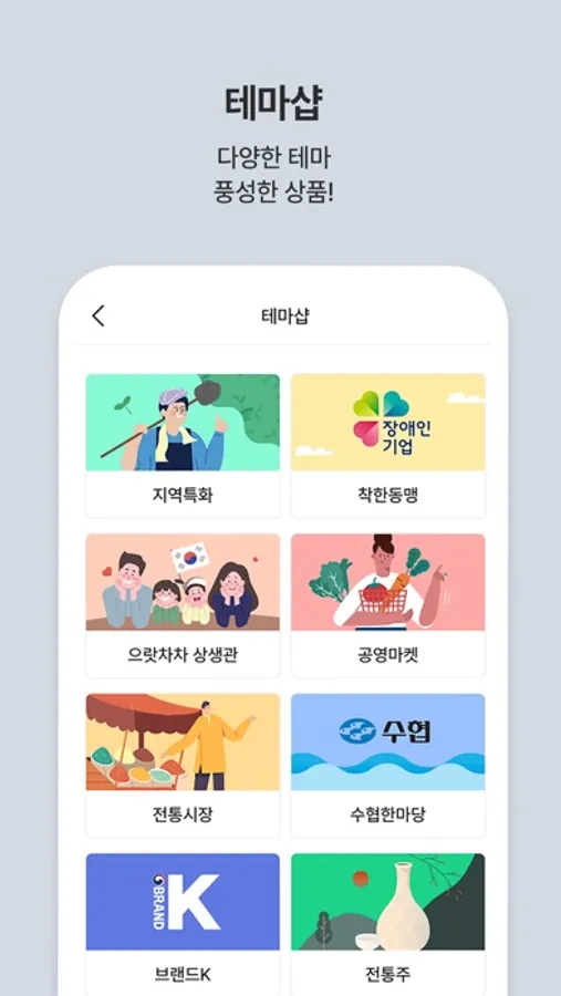 - 지역특화, 공영마켓, 전통시장 등 다양한 테마의 상품들을 만나보실 수 있습니다.