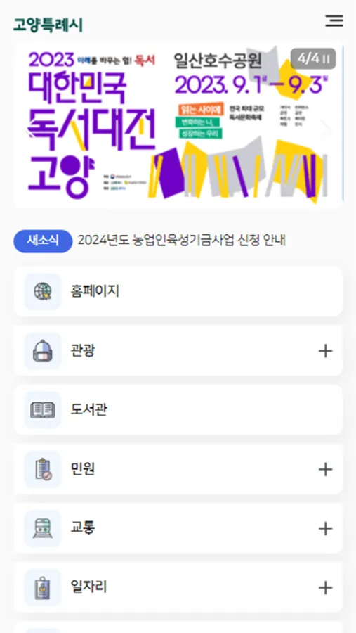 모바일 홈페이지, 도서관, 관광정보, 일자리정보, 생활정보, 교통정보, 무장애관광 등을 열람할 수 있습니다.