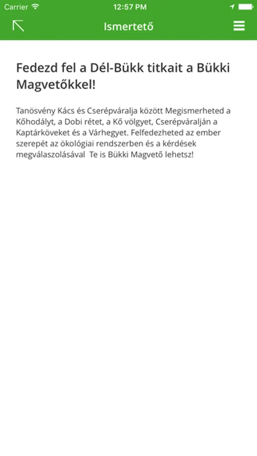 Az app a Dél-Bükk természeti érdekességeit, látnivalóit bemutató Kővölgy Tanösvény által nyújtott élményeket teszi teljessé az állomásokhoz kapcsolódó kvízekkel, érdekességekkel. A Bükki Magvetők tippjeivel a kirándulók hasznos gyakorlati információkhoz juthatnak.
