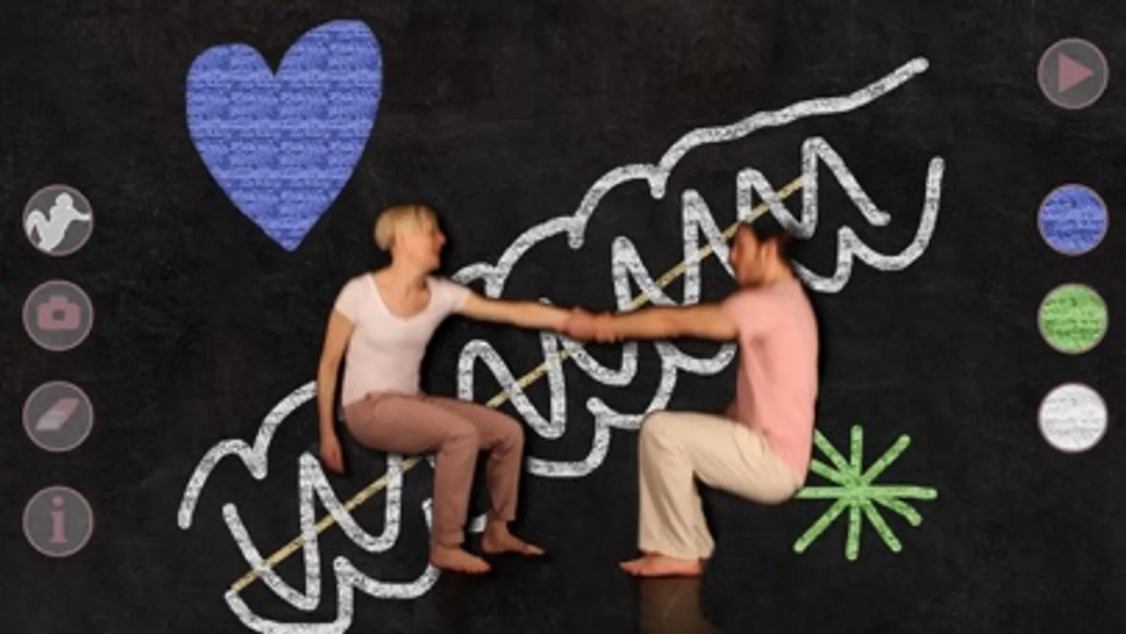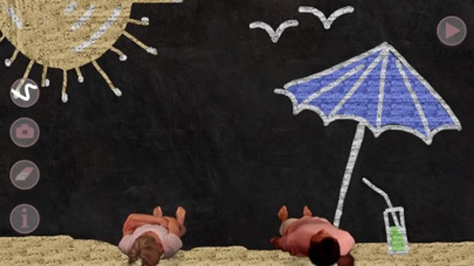 In the second part of this scene, there are six different moves for each dancer - try different combinations to choreograph your dancers. Swipe left, right, up and down all get different results. Also try tickling them with two fingers. And of course you can continue chalking! The erase tool is different in this scene, more like a traditional paint app. Note: When you chalk in this scene the dancers roll off and back on to give you a clean page to draw on.