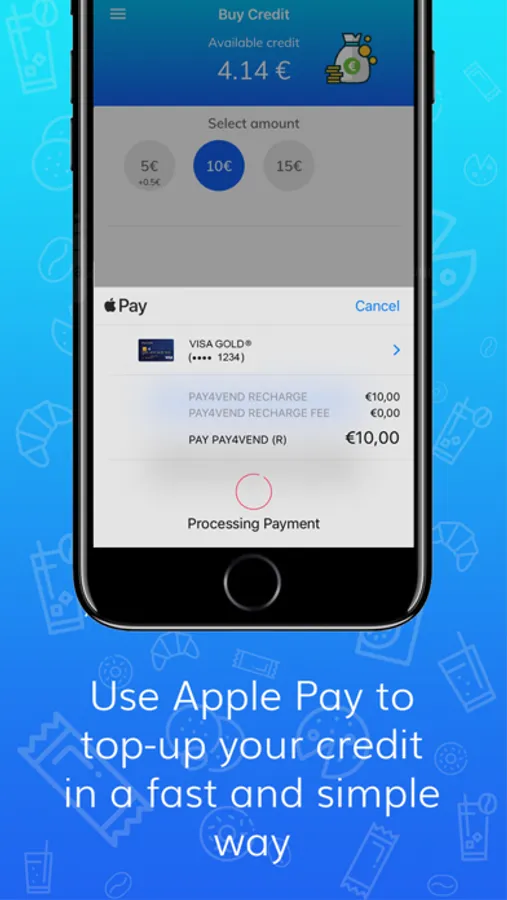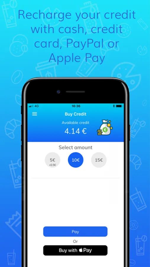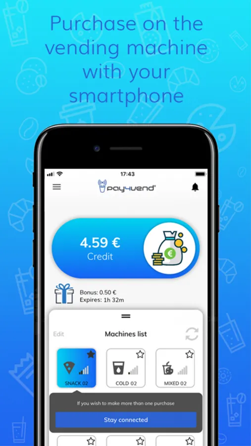 • Pay4Vend uses a special credit for the purchases on the vending machine, which is stored inside the application. Make the top-up by inserting some coins or bills directly on the vending machine or by using PayPal, credit cards or Apple Pay (where active).