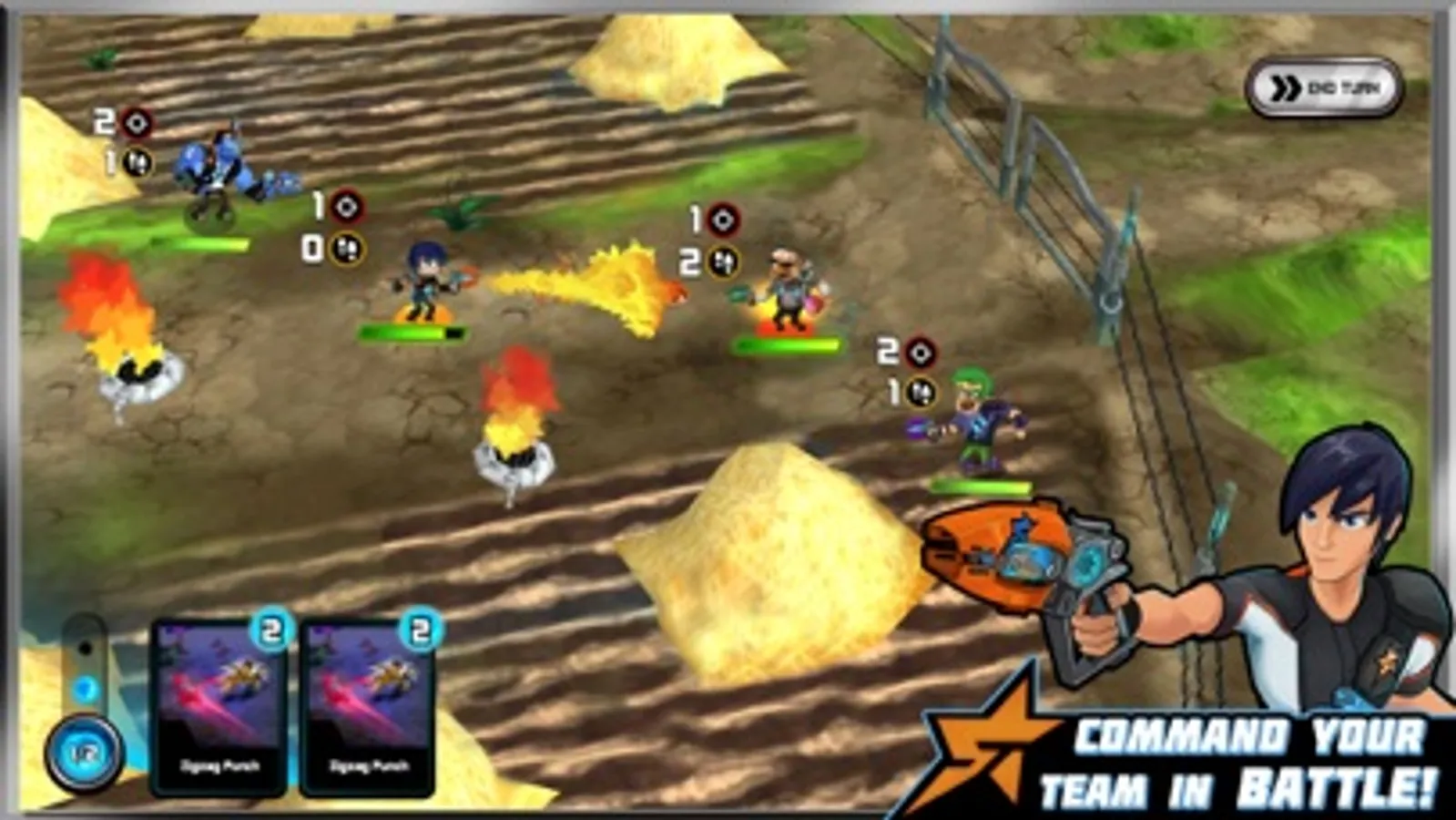 • In battle simulation arenas, command each team member’s movements with easy fling-based style of play—pull back to fling a character into position, then drop an attack card on an enemy to fire a slug!