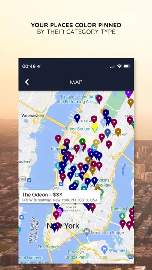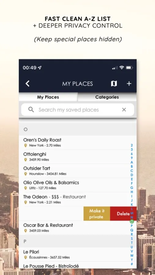 ORGANIZE PLACES & PINS: A-Z list with color-coded categories.