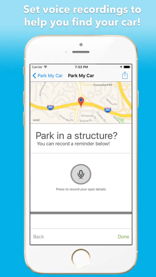 *Record details about your parking spot: When you park in a garage just record your voice with details about the level you're on like "B2, Yellow, Level 3", and QuickPark will play it when you need to find your car.