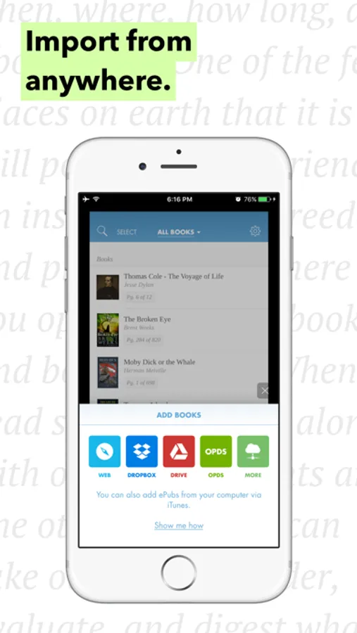 Add ePubs using your favorite cloud services - Dropbox, Google Drive, OPDS servers, and more. You can also use the in-app web browser to download ePubs, or add them using iTunes.