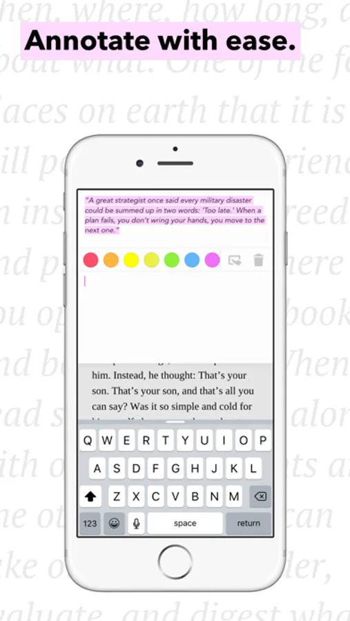 Tap-and-drag or use the selection handles to highlight in any one of several available colors. Write notes for a highlight and refer to them any time you need to. You can also share highlights as images and post them to Twitter or Facebook, or export all your highlights for use elsewhere.