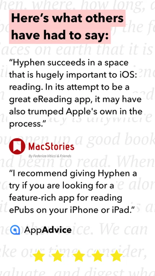 Hyphen is a powerful, easy-to-use ePub reader designed from the ground up with you in mind, with cross-device syncing, super-fast rendering, effortless customization, and intuitive annotation features.