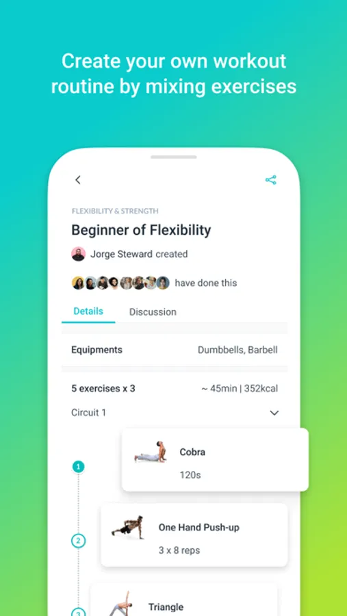 Create your own workout routine from over 800+ bodyweight, dumbbell exercises and yoga poses.