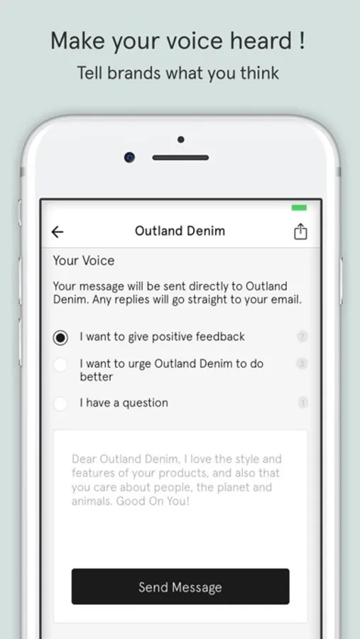 If the brand you're looking for isn't listed yet, just hit a button and we'll rate it! And if your favourite brand doesn’t make the grade, use Good On You to find sustainable alternatives that meet your needs. You can also use your consumer power by sending a message to brands, urging them to do better.