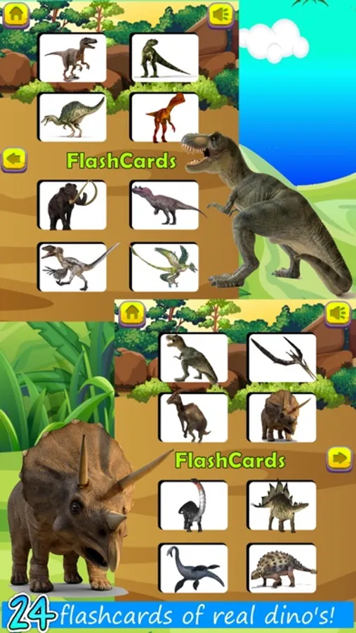 Learning the names and seeing a real life picture of over 30 dinosaurs is interesting and will help you say the proper pronunciation of the dinosaur name. And when you tap the dinosaur you will see the what the fossils look like! And along with names our flashcards also provide some interesting and real facts about the dinosaurs that roamed our planet so long ago. Each card has five little icons that will say if they were a meat or plant eater, how big they were, when they lived, where there fossils were found, and another cool fact, something different for each one. With over 120 facts about the dinosaurs the Dinosaur Games flashcards are interactive fun and will give any budding paleontologist a chance to really learn about their favorite things!