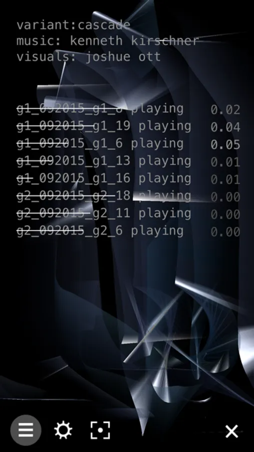 You can view the indeterminate audio engine by tapping the dot in the lower right. The display shows the different elements of the musical composition as they are loaded by the engine through a combination of chance and user input. The center button opens a menu of settings for the app, and the button to the right allows you to take screenshots of the visuals, automatically saving them to your photo library.