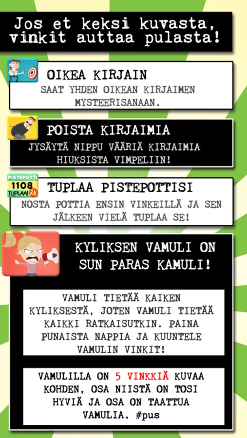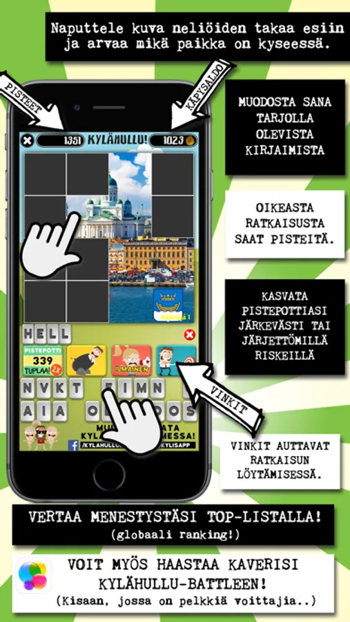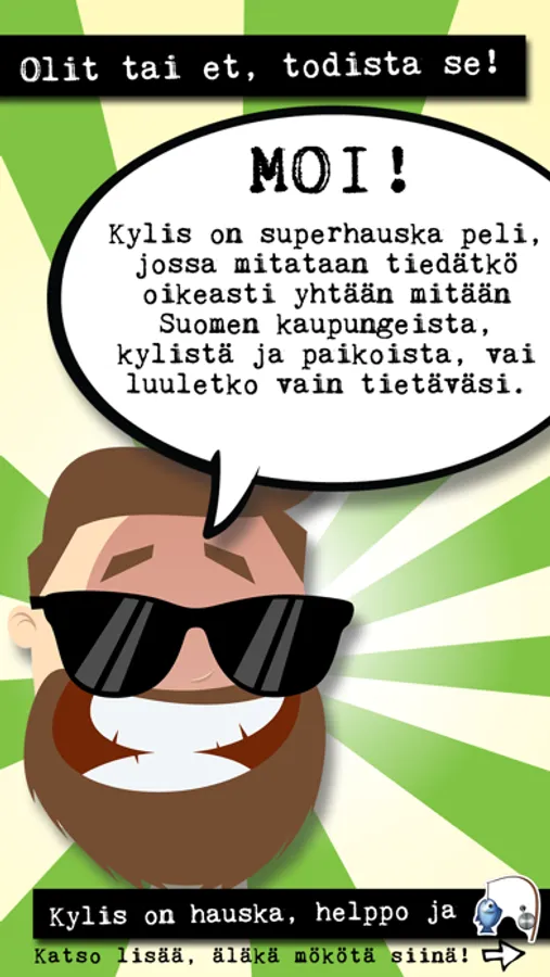 This is a Finnish game about Finnish places. The game is all the way Finnish, so if you want to learn some Finnish and / or learn some Finnish cities and places and humor, this is the app for you. Otherwise it might be too difficult!