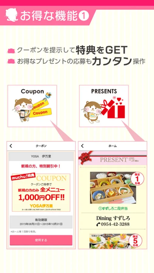 ①クーポン(各お店から提供されているお得なクーポンが掲載、お店で提示頂くと特典があります)