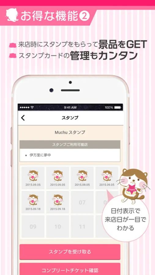 ⑤来店スタンプ(muchu掲載店でmuchuスタンプが来店時に貰えて、スタンプが貯まれば素敵な景品が貰えます)