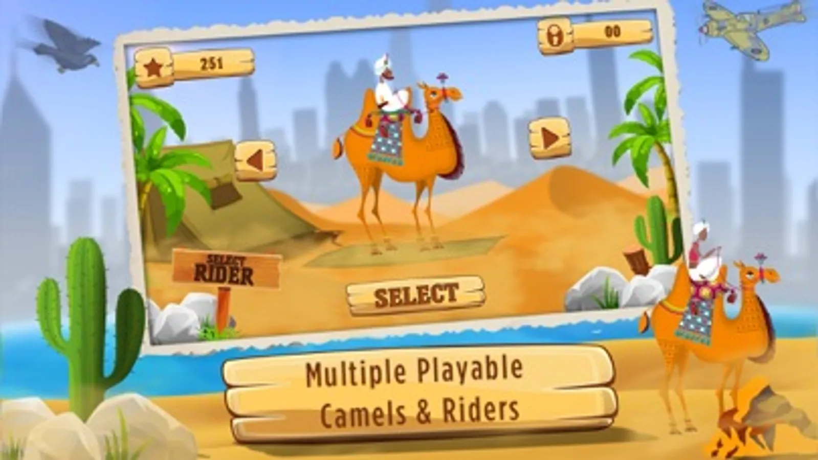 Dubai Camel Rider is an action-packed arcade game. Choose your favorite rider & travel across the scenic landscapes of UAE, with famous Burj Khalifa in the background. Drift through traffic like DXB Police, 4x4 Racing Cars & Fighter Jets. Survive the sandstorms & score higher with the help of awesome power-ups. It's time for some dune bashing in Dubai!