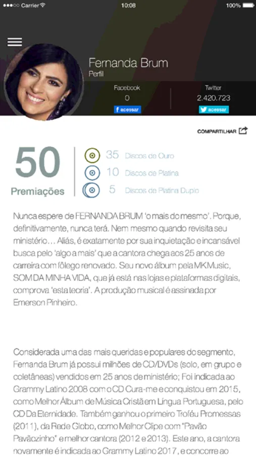 • Perfil dos artistas com todas as informações sobre a carreira da cantora