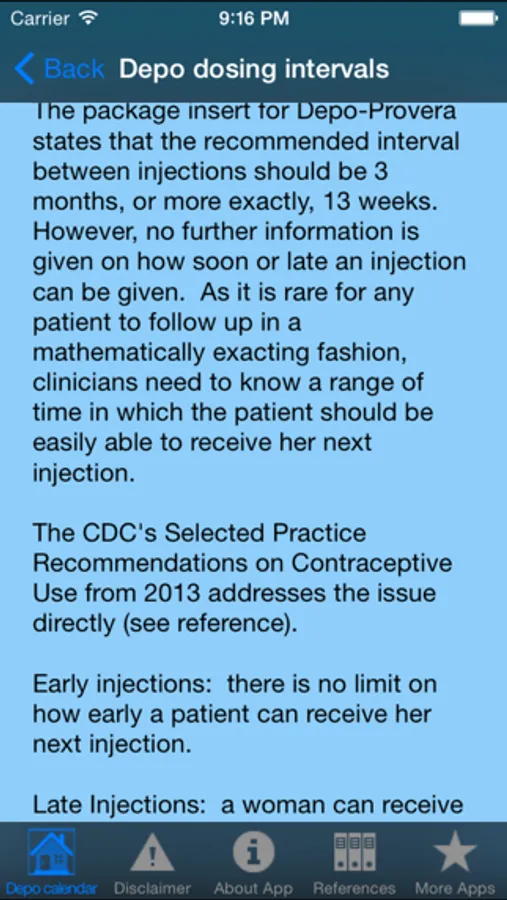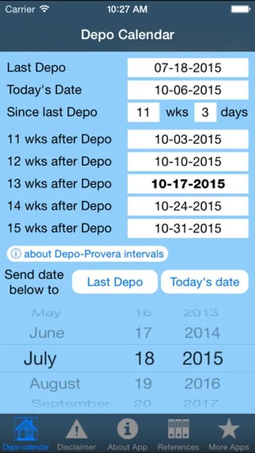 Depo calendar is an app written for clinicians of patients who use Depo-Provera for contraception. Depo should be received every 3 months (13 weeks). The user of this app enters the date of the previous Depo injection to see the date 13 weeks later when the patient is due. As many practices have varying windows of time when a patient could and should receive her next injection (11-13, 12-14, 13-15, and more), I also offer dates for when 11, 12, 13, 14, and 15 weeks arrive after the last injection, plus the time from the last injection to the current time (or any date). I also cite the evidence on what that injection window should be. This app answers the following questions: