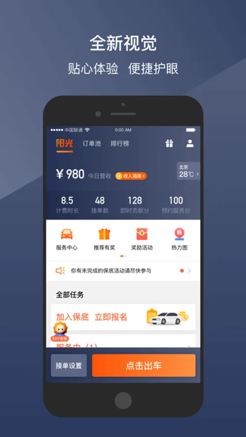 阳光出行车主端为签约司机和车队的服务端,司机能通过此应用接单、抢单、派单、出车时间、出车车辆、相关认证且自我展示以及实现工资的结算与提现等