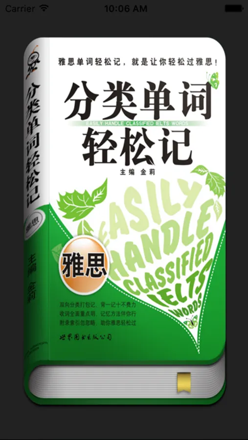 雅思考试必备,助您轻松突破新雅思考试单词关。《分类单词轻松记—雅思》2009年6月第1版第1次印刷手机版同步发行,根据新托福特点,收录了5000余条常考词汇;在每个类别之前列举了该类的重点词组与搭配,供考生预习测验,并辅以小段助考引言,提示复习重点,引导考生学习;特别提示了每个单词可能出现的题型,帮助考生目标明确、有侧重地复习;另外还结合托福考生的特点,编加适合他们的记忆方法,包括词根词缀、拆分、图形记忆等方法。记忆法与分类记忆相结合,帮助考生彻底冲破单词记忆的屏障。