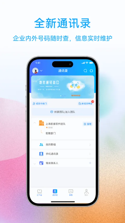 捷务通是为团队量身打造,可提供融合通信和移动办公一体化团队内部交流工作。以团队通讯录、IM、工作圈为基础,公告发布、任务管理等办公轻应用,支持行业应用和团队个性化应用自主接入,满足团队移动办公的数据安全性、反应及时性等需求,帮助团队降低沟通成本,提升工作效率。