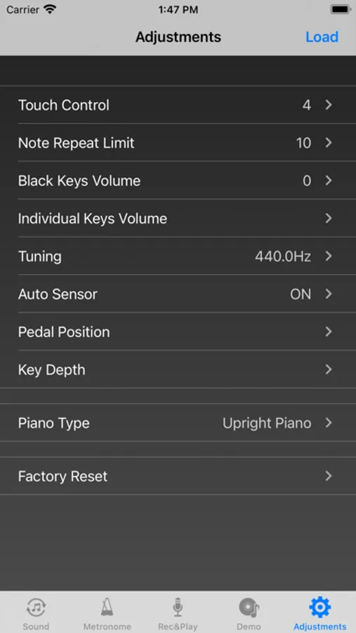 * Adjustments - Touch control, Note repeat limit, Black key volume, Individual key volume, Tuning, Auto sensor, Pedal position, Key depth, Piano type, Factory reset