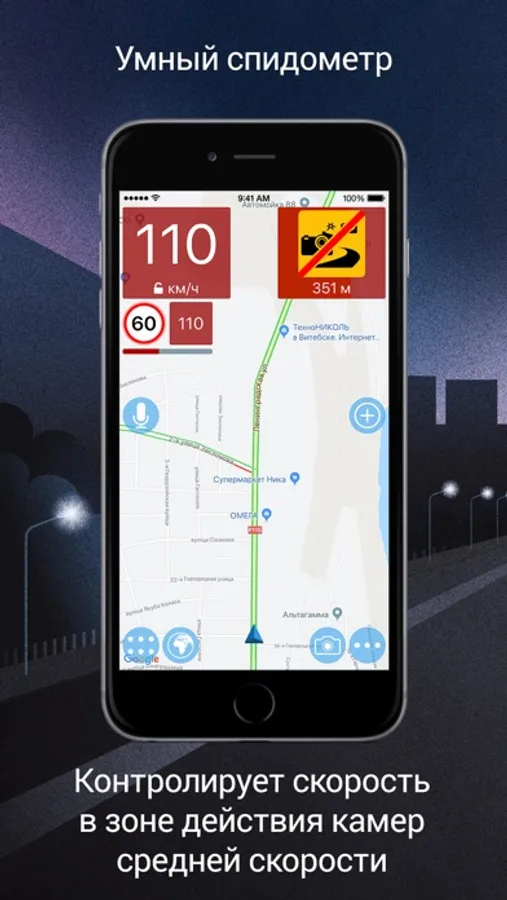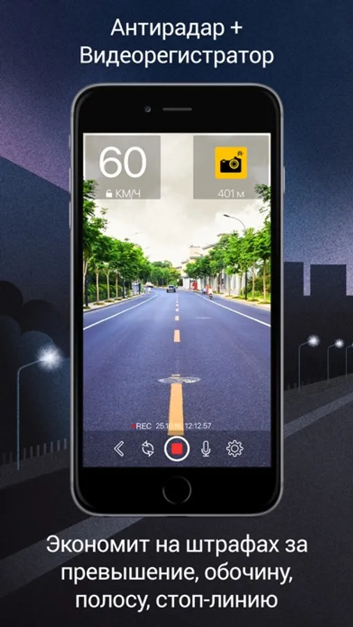 Предупреждает о всех типах камер фиксирующих нарушения ПДД и о других опасностях на дороге.