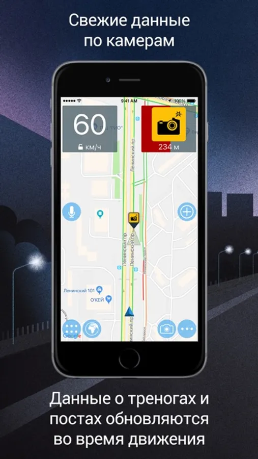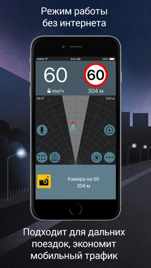 Приложение работает в фоновом режиме, одновременно с программами-навигаторами. Предупреждает об опасностях голосом через Bluetooth, динамик телефона, AUX