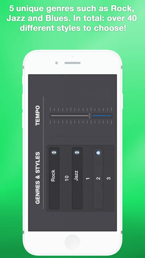 Band Creator accompaniments you using different styles: Rock, Jazz, Blues, Folk, R&B and Alternative. Each genre has up to 10 different styles you can play to. Choose the one that inspires you and unleash your creativity!