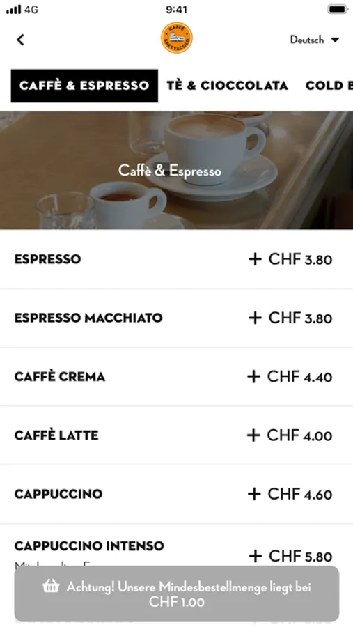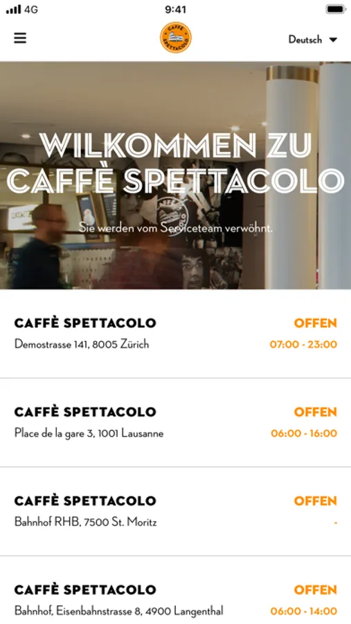 Mit der Caffè Spettacolo App Kaffee auf den gewünschten Abholzeitpunkt vorbestellen und ohne Anstehen abholen. Wähle Deine Caffè Spettacolo Filiale aus und anschliessend Dein Lieblingsgetränk. Bestelle es auf den gewünschten Abholzeitpunkt und bezahle es gleich in der App. Deine Bestellung steht zum gewünschten Zeitpunkt bereit zum Mitnehmen und Du musst nicht mehr anstehen. Somit lässt sich der Kaffee nahtlos in Deinen Tagesablauf integrieren. Natürlich kannst Du auch Cornetti, kalte Getränke und vieles mehr mit der App vorbestellen.