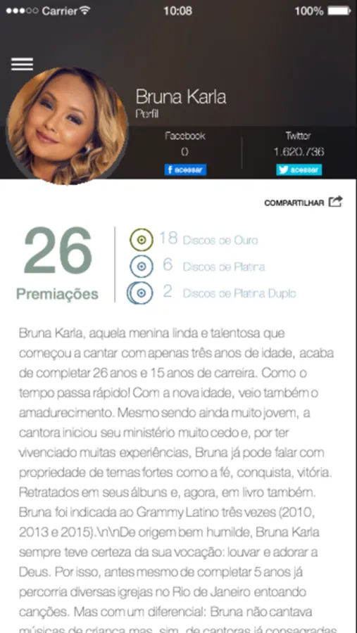 • Perfil dos artistas com todas as informações sobre a carreira do cantor