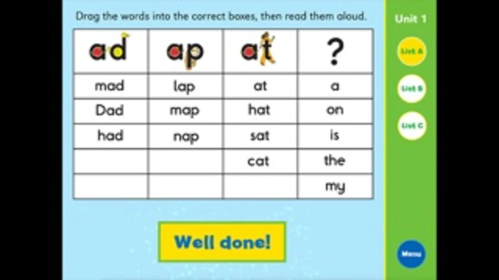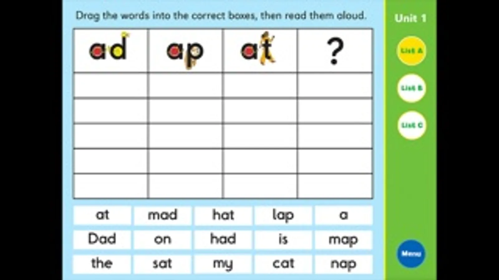 There is a Word Sort game for each Unit in the Letterland Grade One Teacher’s Guide. This app is ideal for use in small groups to reinforce the lesson and improve reading accuracy and spelling skills. Children can sort the words to draw attention to their sounds and spelling patterns. There are 16 to 24 cards for each unit, including several Tricky Words.