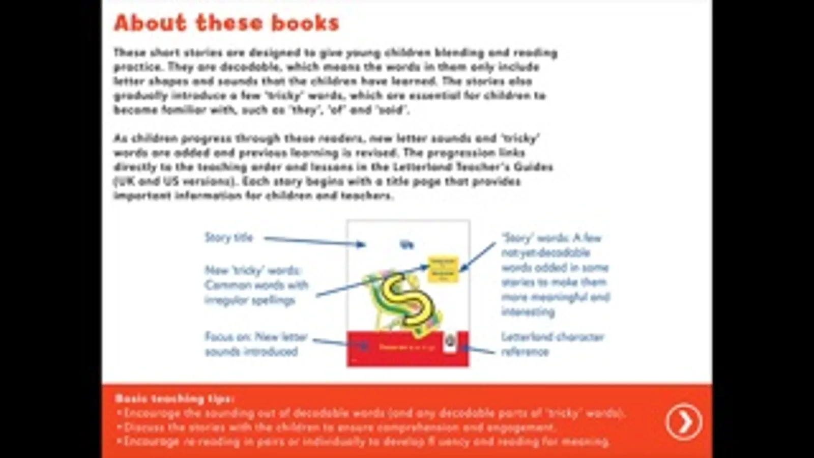 With the Letterland Phonics Readers, children will have the satisfaction of reading whole books. They can also listen to the stories being read aloud and enjoy the simple animations on nearly every page. This series of imaginative, decodable stories gradually introduces new phonic elements and builds on the vocabulary from previous stories. The progression in learning is clear, measurable and linked to lessons in the Letterland Teacher’s Guides. The readers fully meet the DfE core criteria for high quality synthetic phonics resources.