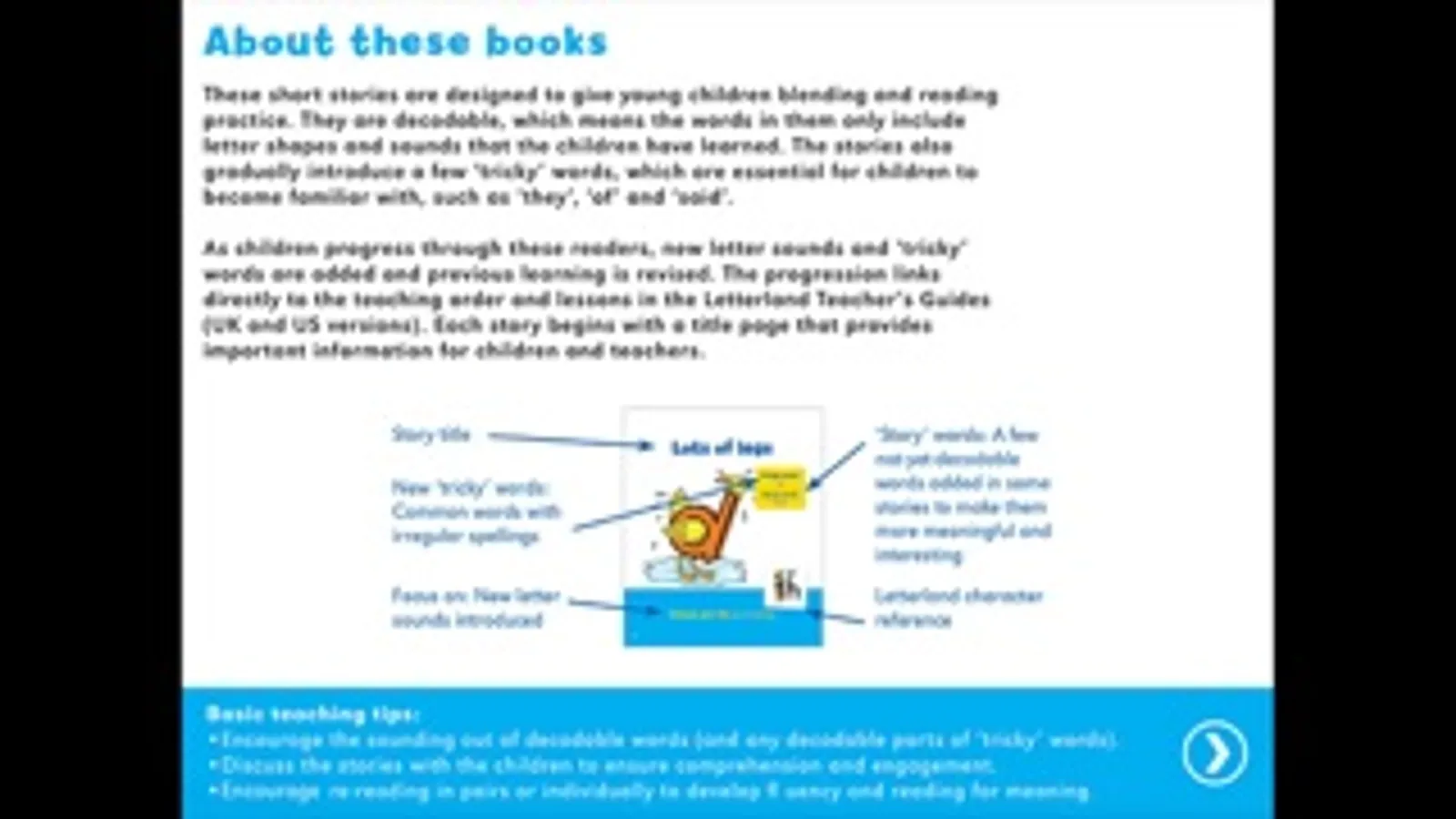 With the Letterland Phonics Readers, children will have the satisfaction of reading whole books. They can also listen to the stories being read aloud and enjoy the simple animations on nearly every page. This series of imaginative, decodable stories gradually introduces new phonic elements and builds on the vocabulary from previous stories. The progression in learning is clear, measurable and linked to lessons in the Letterland Teacher’s Guides. The readers fully meet the DfE core criteria for high quality synthetic phonics resources.