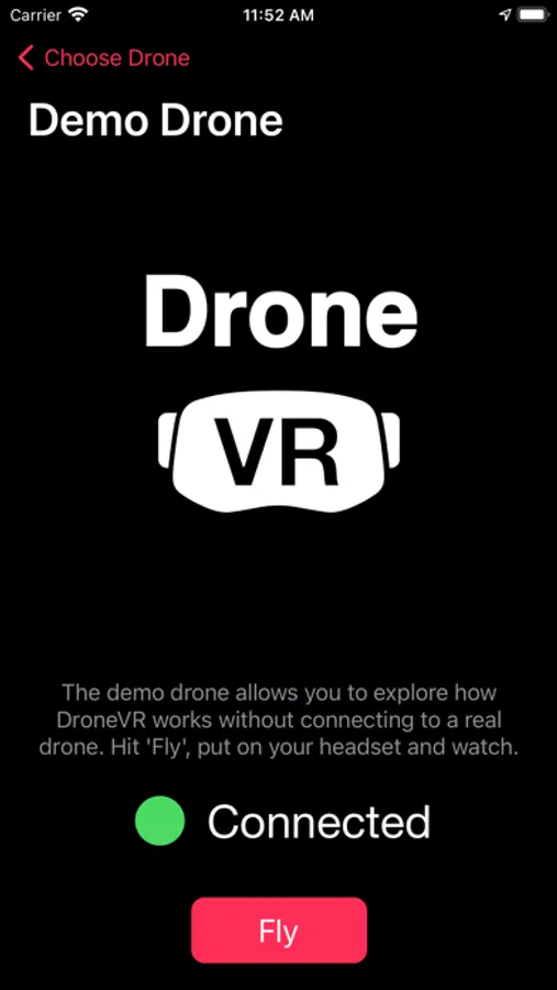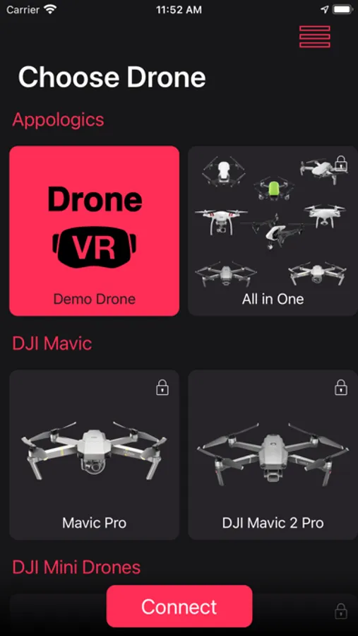 Important: The free version of DroneVR supports the Ryze Tello drone. If you want support for further DJI drones you need to activate this functionality via In-App purchase. See below for a list of supported drones.