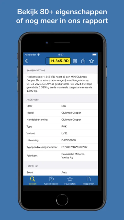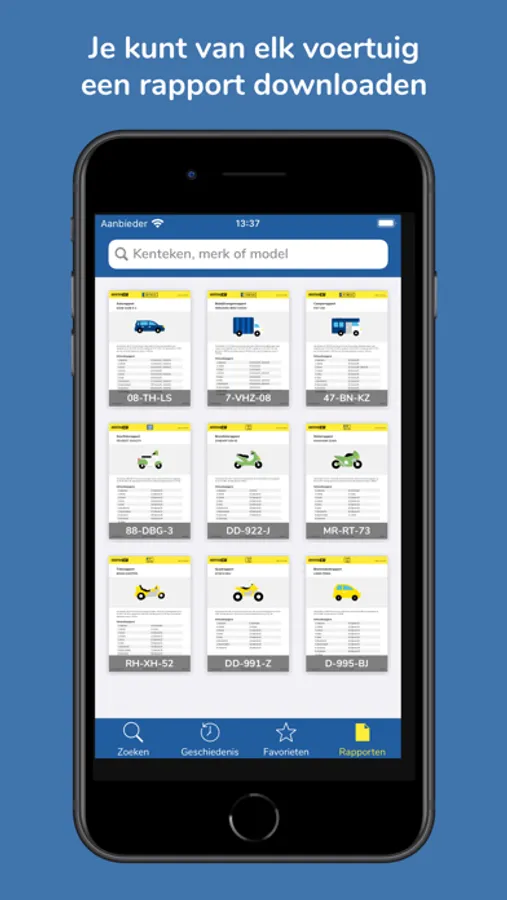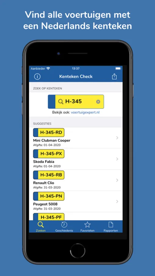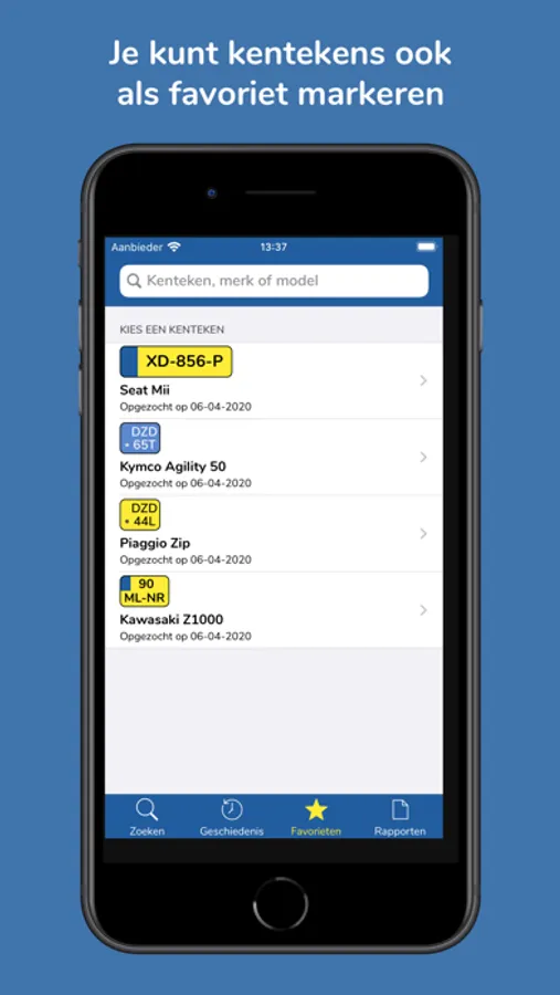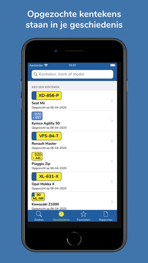 Het kenteken, merk en model kun je terugvinden in de geschiedenis tab. Je kunt voertuigen uit jouw geschiedenis ook toevoegen als favoriet, deze kun je daarna terugvinden in de favorieten tab.