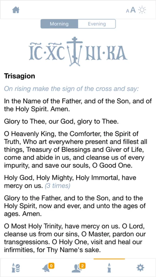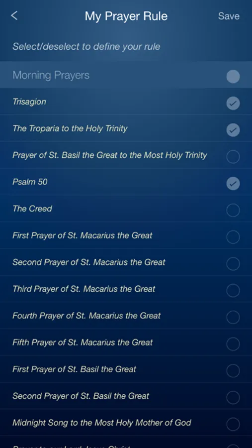 With this App you can create and save your own Prayer Rule for Morning and Evening Prayers so that it includes just the prayers you want to pray including selected prayers from our collection of Prayers for Children, Daily Readings from the Orthodox Study Bible (OSB App required), Psalm of the Day, Intercessory Prayers, Commemorations, Prayers before Communion and the Prayers of Thanksgiving After Communion.