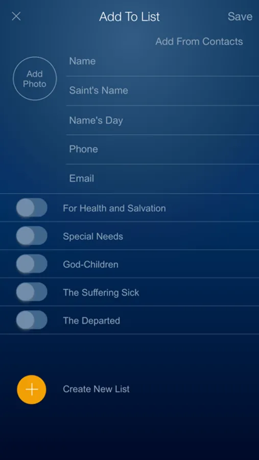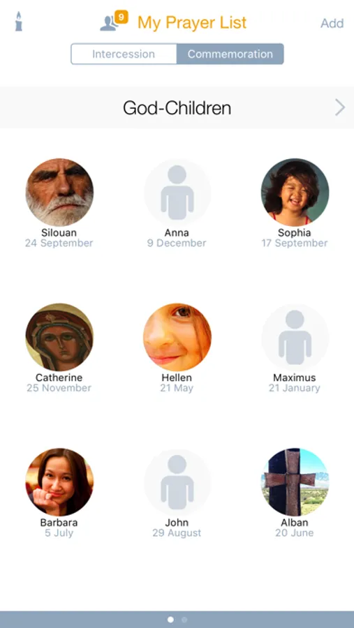A customizable prayer list for Commemorations includes features that allow you to add photos of your family, God children and loved ones, their names dates and email address so you can email them on their names day and wish them Many Years!