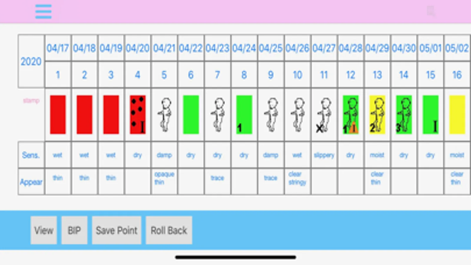 billingsMentor® avoids the use of stamps and symbols in the fertility chart by visualising fertility as a simple bar chart that combines fertility with the rules of the Billings Method. This format is intuitive for the new user. There is an option to use the traditional stamp or symbol format if desired.