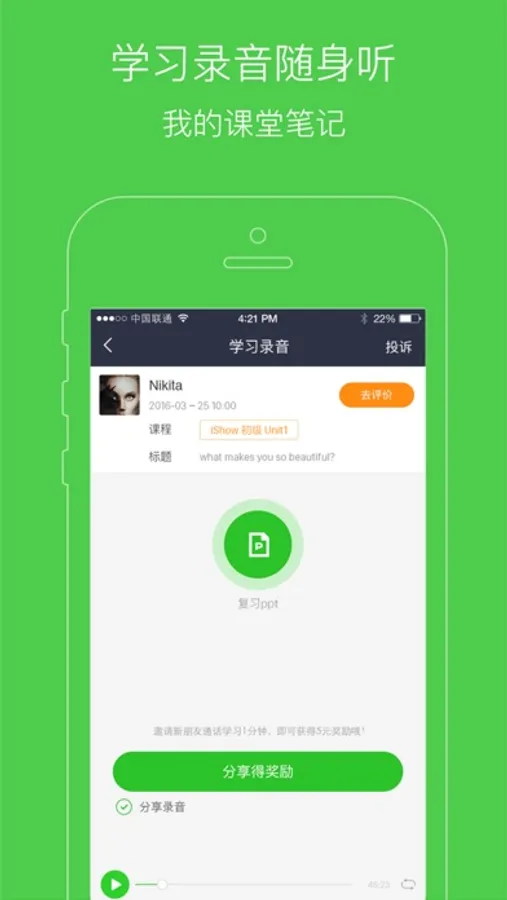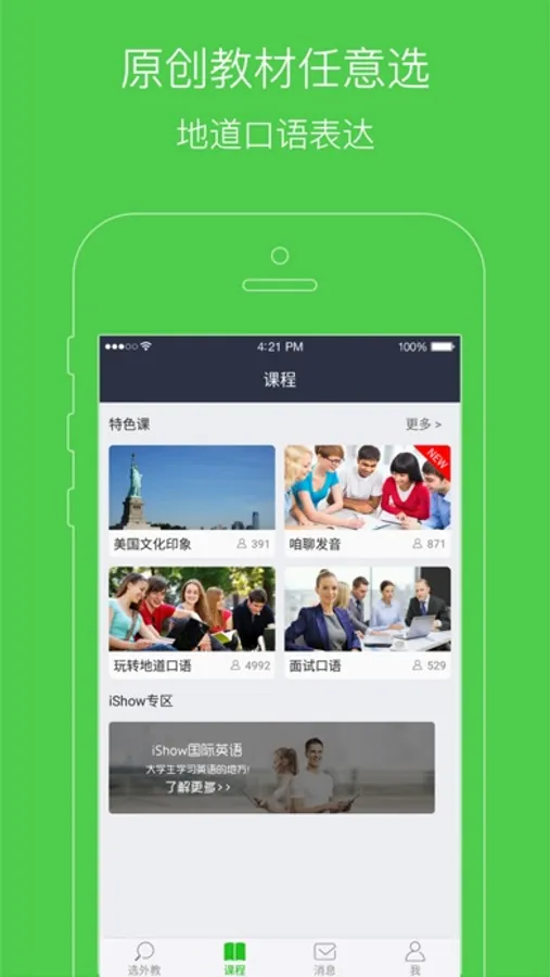 7、打通线上线下英语口语学习:提供线上100%真人外教一对一交流,大量输出提升口语,同时有iShow线下11家分校系统学习不断输入同步实现学英语水平迅速提升。