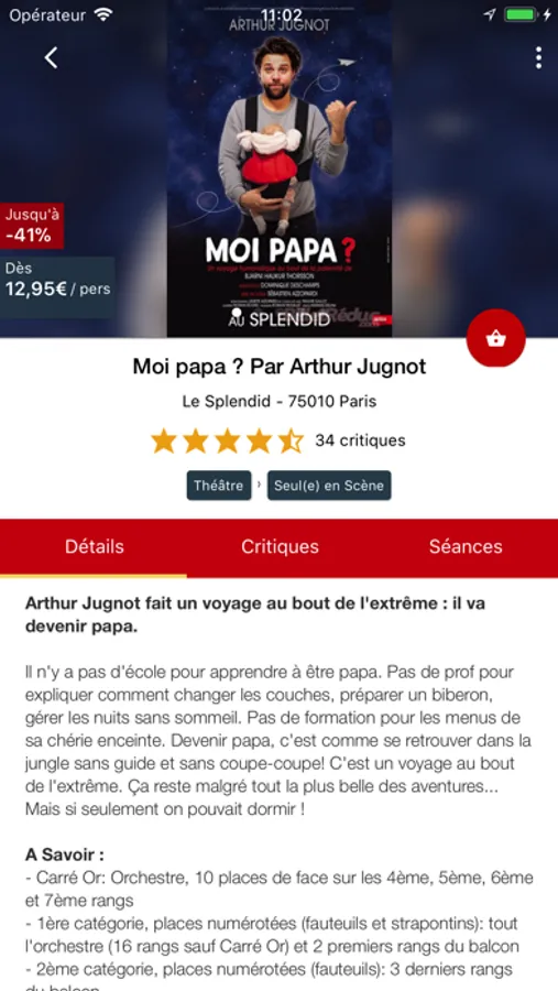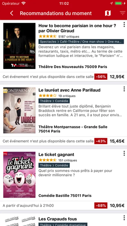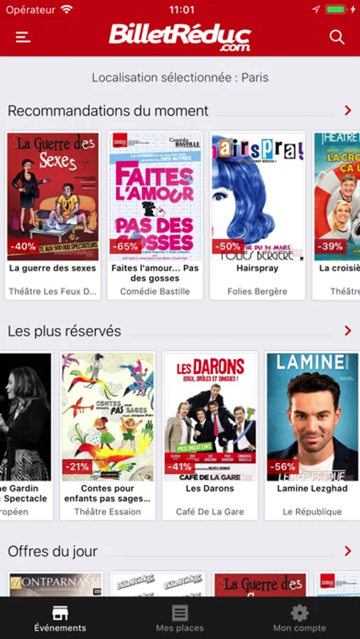 Réservation de places de spectacles prix réduits, pour des pièces de théâtre, one man show, de concerts, de soirées à Paris, Lyon, Marseille et dans toute la France.