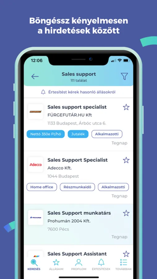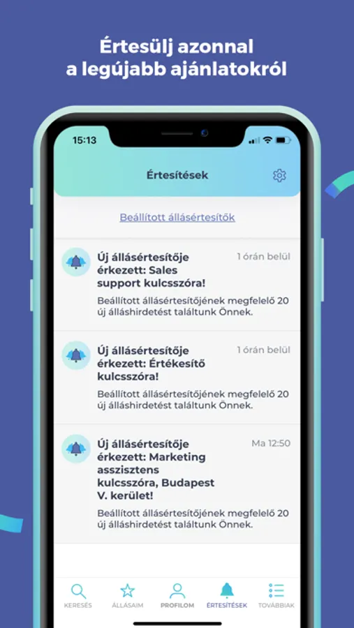Azonnal értesítünk a téged érdeklő friss állásajánlatokról, ha elmented értesítésként az álláskeresési szempontjaidat.