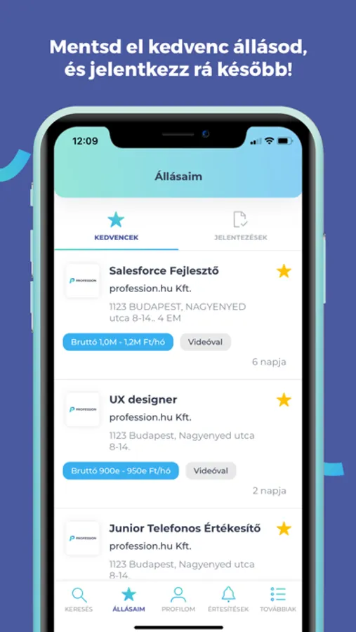 - jelentkezés álláshirdetésre az alkalmazásból,