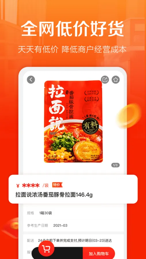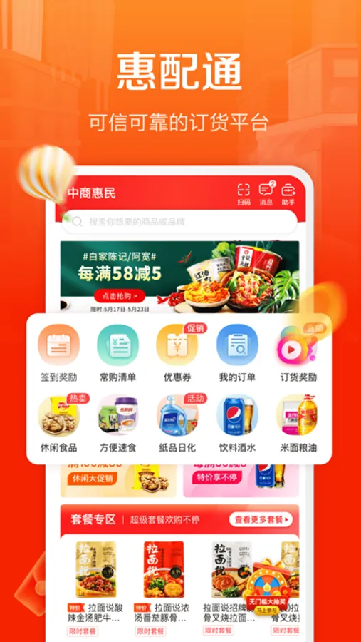 惠配通是惠民网旗下面向超市老板的客户端,专门为社区超市经营管理者打造的线上订货APP,提供超市日常销售的食品、零食、粮油等生活必须的商品,充分利用互联网和电商平台的优势,解决社区超市进货难,进货贵,进假货的问题。线上订货、线下配送,为社区超市提供货品支持,提高了超市运营的效率。同时惠配通还会不断推出各种满额返利、限时特惠、新品特价等优惠促销活动,给用户满意的服务体验。