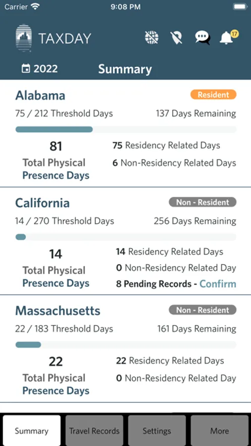 • Threshold notifications and alerts: Never risk losing track of how many days you’ve spent in a particular jurisdiction. TaxDay warns you when you’re close to triggering tax day thresholds and becoming a potential resident.