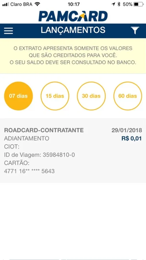 - Extrato de lançamentos de frete, vale-pedágio e vale-abastecimento;