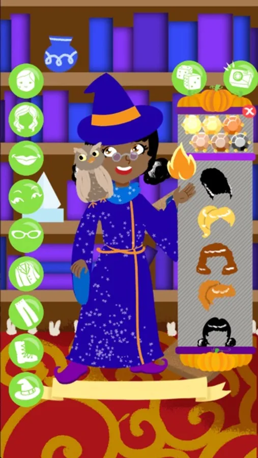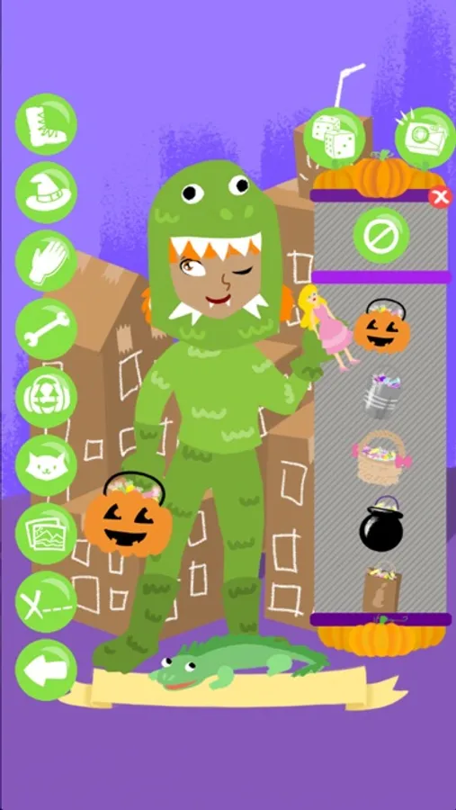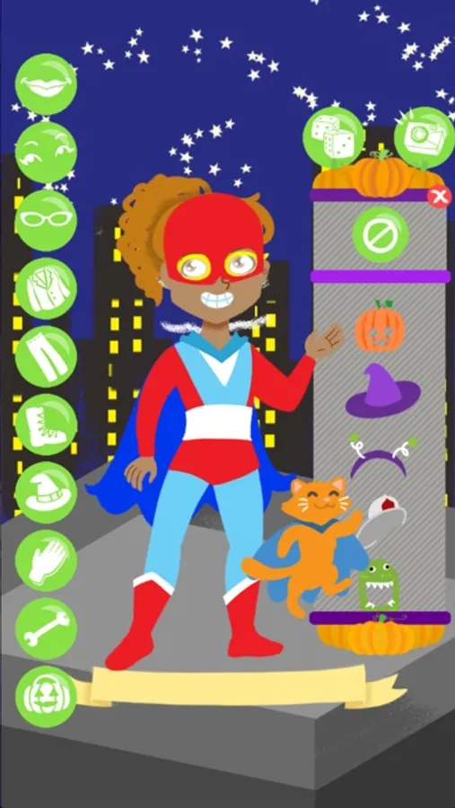 Then choose from your favorite character costumes and make the coolest Halloween costume ever! Kids can choose a matching costume with tops, bottoms, hats, gloves, shoes, accessories and candy buckets, then complete the look with a themed pet (lots of black cats and bats!) and a background. Or go crazy! Children can mix and match costume ideas- what about a witch from space, a panda bear pirate or a vampire fireman? A dice button is included to randomly shuffle different looks together- the possibilities are endless!